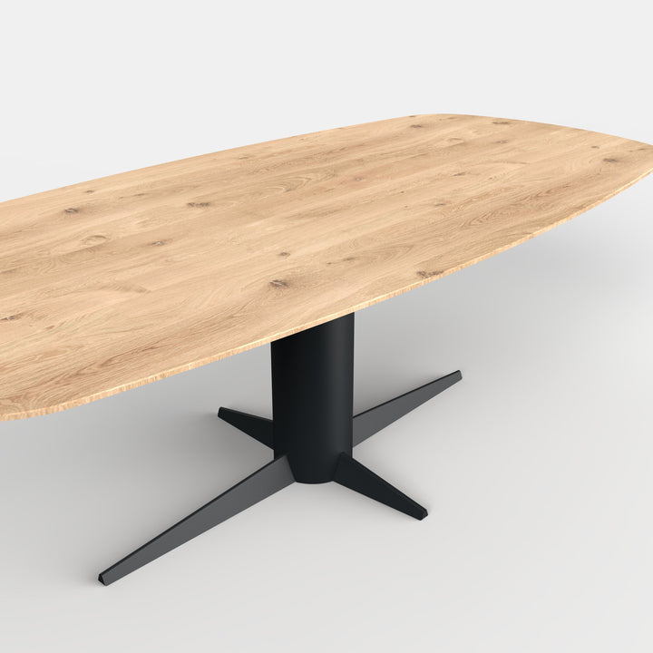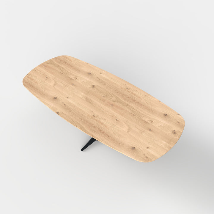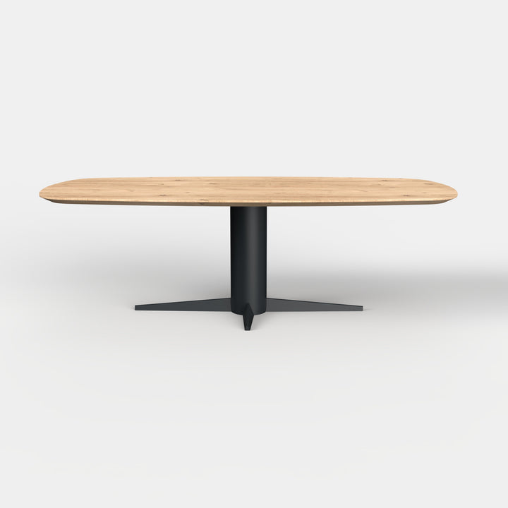 De afgeronde hoeken en licht versmalde zijkanten geven de tafel een mooie, vloeiende vorm. Het is een fijne combinatie van een ovale en rechthoekige tafel: zacht van vorm én lekker ruim. Dankzij de middenpoot zit je er altijd prettig bij, zonder dat er poten in de weg staan – perfect voor gezellige etentjes.