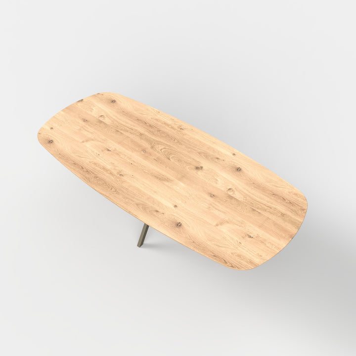 Het blad is 4 cm dik en gemaakt van hoogwaardig, massief eikenhout. Elke plank wordt met zorg geselecteerd en ambachtelijk afgewerkt in onze werkplaats in Giessenburg. Noesten worden opgevuld met hars in zwart of houtkleur – net wat jij mooi vindt – zodat het oppervlak glad is, maar het natuurlijke karakter behouden blijft.
