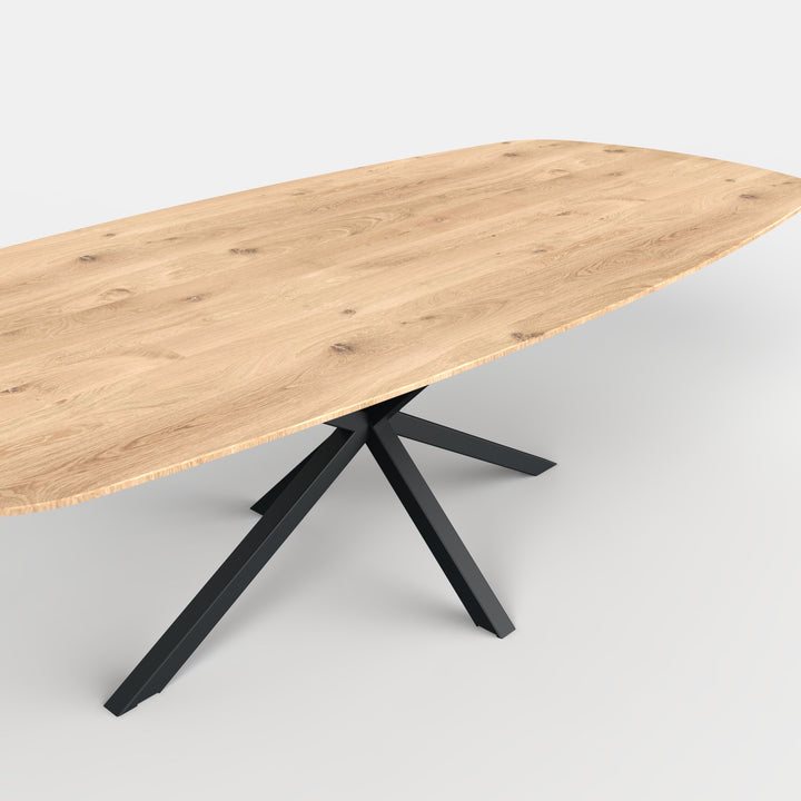 Het 4 cm dikke blad is gemaakt van hoogwaardig massief eikenhout. De knoesten worden zorgvuldig opgevuld, zodat het oppervlak glad is en prettig aanvoelt, terwijl het levendige karakter van het hout mooi zichtbaar blijft. Geen twee tafels zijn hetzelfde – dat maakt jouw tafel echt uniek.